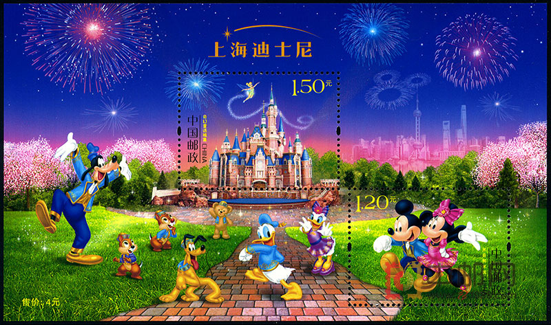 《上海迪士尼》特种邮票小全张以上海迪士尼乐园奇幻童话城堡为中心,画面展现了迪士尼经典的卡通形象,远处是隐约可见的上海地标性建筑,星空中用多彩的礼花加以渲染,乐园里无处不在的新奇、刺激和冒险都在等着人们去点亮心中的梦想。