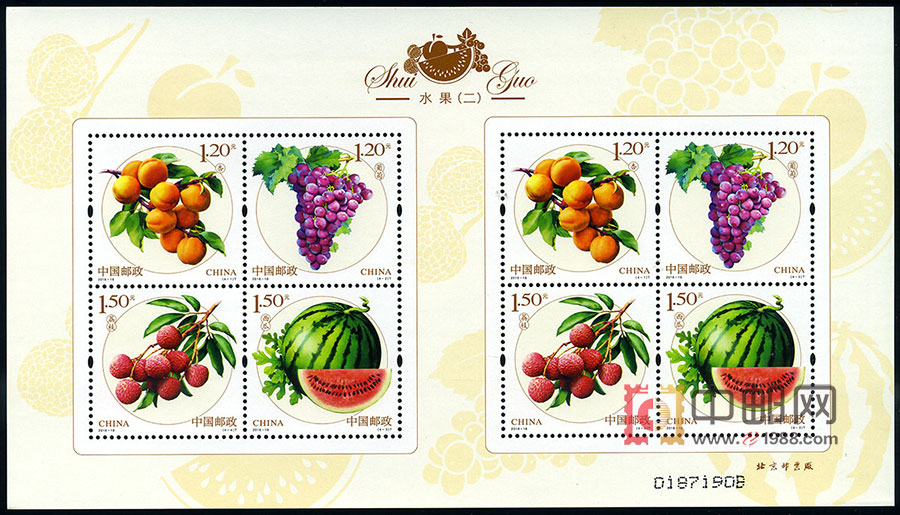 - 商品详情:2016年7月23日,国家邮政将要发行水果(二)邮票一套四枚。这次发行的水果邮票是葡萄、荔枝、杏和西瓜。葡萄寓意多子,荔枝寓意大利,杏寓意幸福、兴旺发达、幸运,西瓜寓意大红大紫。