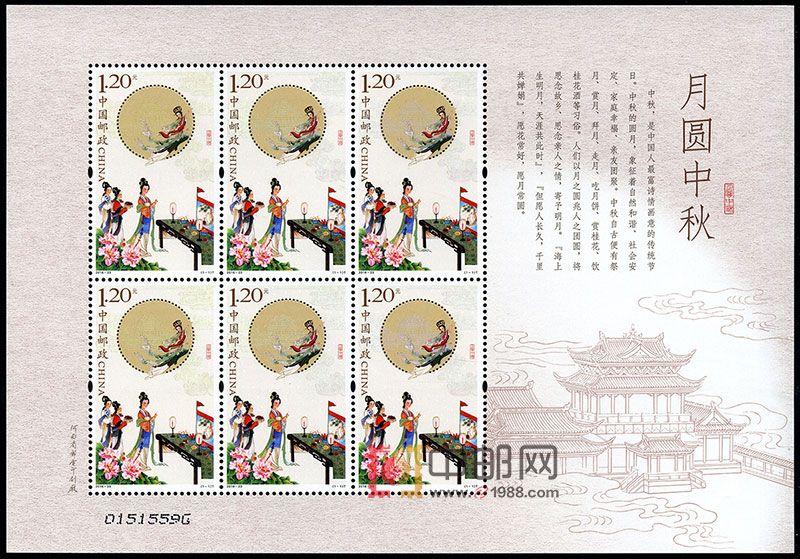 中国邮政定于2016年8月28日发行《月圆中秋》特种邮票1套1枚,邮票面值为1.20元。