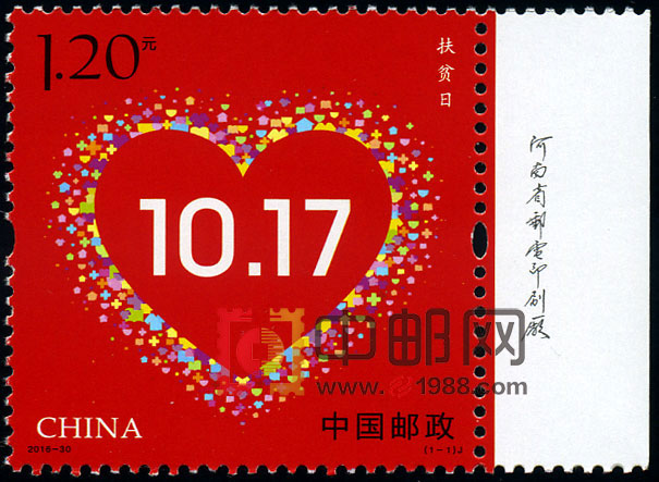 - 商品详情:中国邮政定于2016年10月17日发行《扶贫日》纪念邮票1套1枚,邮票面值1.20元。