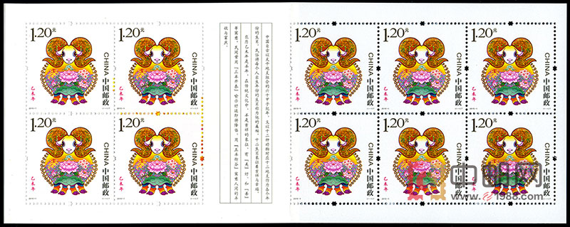 中国邮政定于2015年1月5日发行《乙未年》特种邮票一套1枚,面值1.20元。同时发行小本票一枚,编号(52)。《乙未年》邮票设计者为吴冠英,吴冠英老师曾设计了三轮生肖邮票中兔年和蛇年的邮票。邮票以绵羊为造型。羊角以产值花草纹样为装饰,象征福气延绵不绝,长长久久。羊身上为牡丹、莲花等人们喜闻乐见的花卉,寓意四季平安、富贵有余;花边伴以祥云、水波纹等吉祥纹饰,水动则财来,水和云以流动的形象,是整个画面动静结合。羊两边为12卷毛,牡丹花为三层,寓意生肖邮票发行三轮,每轮12枚。