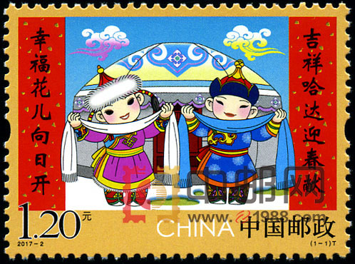 2017年度《拜年》邮票表现的是两个主人公“欢欢”、“喜喜”身着内蒙古少数民族的服饰、献哈达、迎新春、拜大年的场景,背景有雪地、蒙古包和祥云,画面清新明媚,吉祥喜庆,民族气息浓郁。固定格式的对联为“吉祥哈达迎春献,幸福花儿向日开。”这样的设计图案也是为了配合2017年内蒙古自治区成立70周年活动,于此呼应,二者结合。