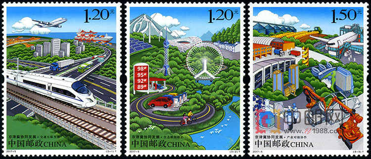 据介绍,该套邮票以交通、生态、产业的“三个突破”为表现内容,着力体现京津冀协同发展战略中先行启动的领域。第一图交通互联互通,描绘了三地之间海、陆、空互联互通的立体交通网络;第二图生态联防联治,体现了规划中扩大生态空间的推进目标,展现了一幅天蓝、水清、地绿的宜居生活蓝图;第三图产业对接协作,突出了三地产业合作园区作为产业转移主要载体的角色定位和紧密关系,体现了北京建设科技创新中心、天津重点发展高端制造、河北打造产业转型升级试验区的产业分工协作定位。
