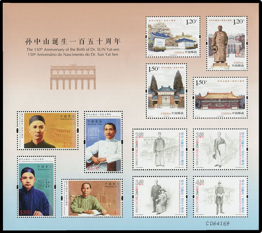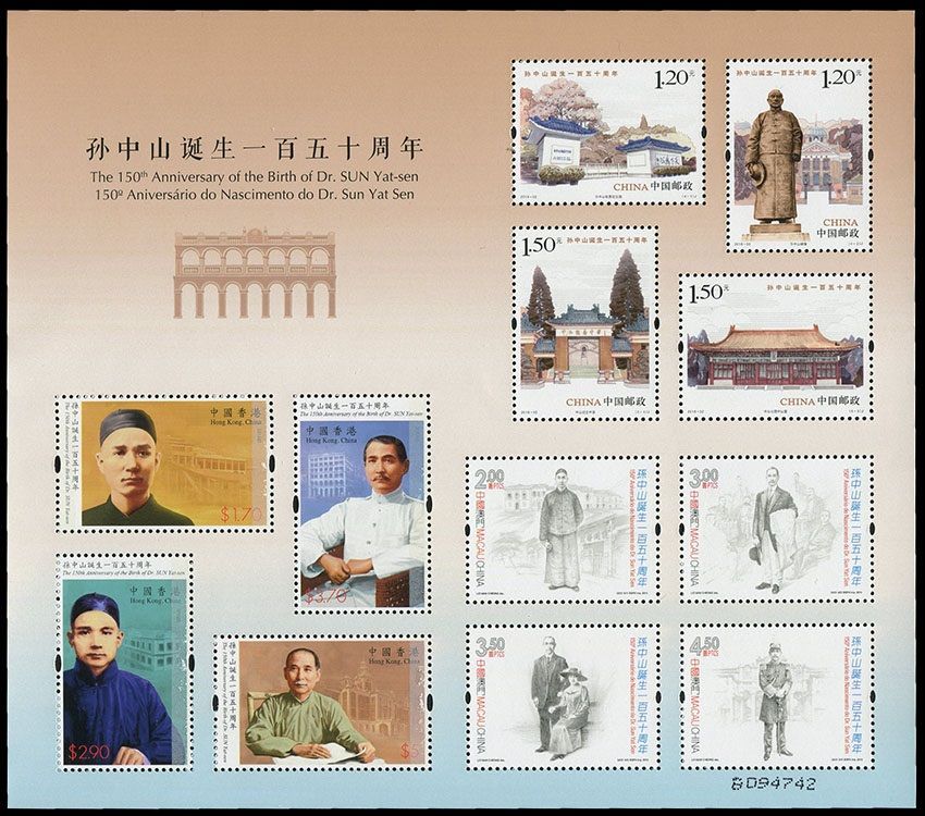 中/ 港/ 澳2016年 三地联合发行的孙中山诞辰150周年小全张 共三枚