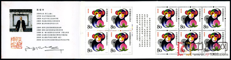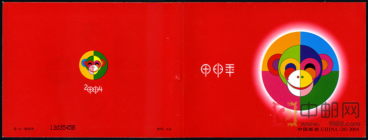 2004年农历甲申年,即猴年。这是第三轮生肖票的第一套。猴为常见的攀援动物,在中国传统文化中意蕴浓厚,吉祥和象征。方形的票面上,“猴三世”正笑眯眯地冲着我们乐,左手挠头,右手抱桃,憨态可掬,灵气毕现。简洁的画笔、夸张艳丽的色彩使之与第二轮生肖票产生了明显的“代沟”。整套邮票的亮点在鲜艳的猴头肖像和蟠桃上,不同的色块将猴脸分为左右两半,错落搭配和谐到位,白色的邮票底图上主要是红、黄、黑、绿等鲜明的色块,视觉层次分明,简约又好看。祝愿人们在新的一年:时尚洋溢、和谐美满、四季平安、健康长寿。国家邮政局专门印制了含4枚生肖邮票的小版张,赠送给新邮预订户。另发行小版张和小本票。