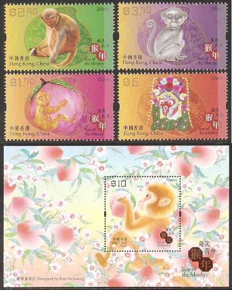 1477+1657/2016香港邮票,生肖猴,4全+小型张。