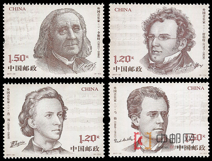 - 商品详情: 中国邮政定于2017年9月9日发行《外国音乐家(二)》纪念邮票一套4枚,图案内容分别为:舒伯特、肖邦、李斯特、马勒。