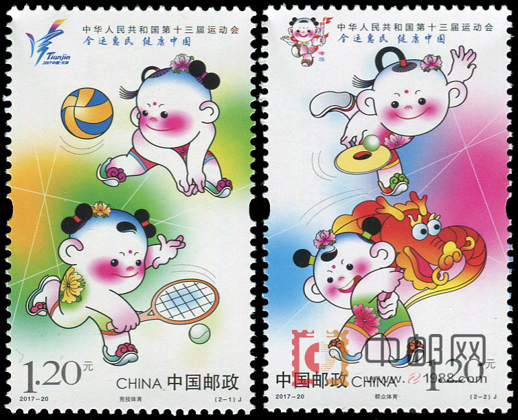中华人民共和国第十三届运动会将于2017年9月在天津市举行,天津在2011年8月16日成功取得第十三届全运会的主办权,中央政府取消北京、上海和广东三地垄断举办权后,继江苏、山东与辽宁后的第4个主办全运会的省市。中国邮政定于2017年8月27日发行《中华人民共和国第十三届运动会》纪念邮票一套2枚,图案内容分别为:竞技体育、群众体育,全套邮票面值为2.40元。