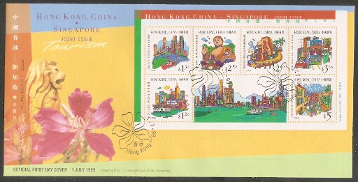 1999香港首日封,旅游业(与新加坡联合发行)(小全张),每枚。