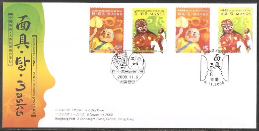 2008香港首日封,面具(与韩国联合发行),每枚。