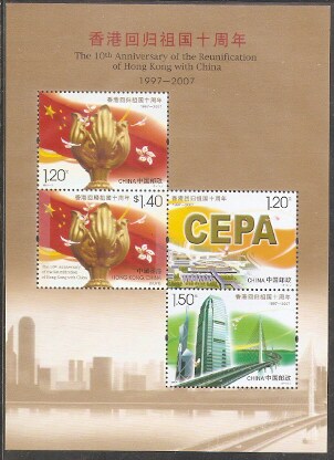 2007香港邮票,回归十周年(与中国联合发行),小版张。