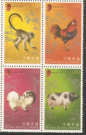 2007香港邮票,绒面生肖(猴,鸡,狗和猪),4全。