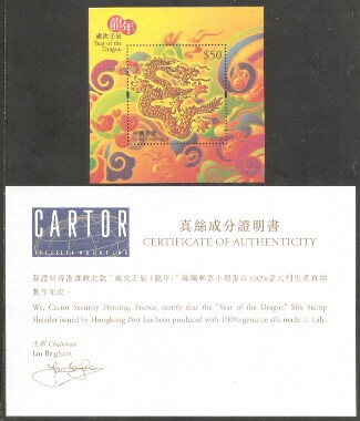 2012香港邮票,生肖龙(丝绸),小型张(带证书)。