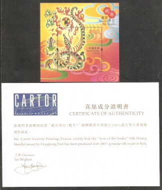 2013香港邮票,生肖蛇(丝绸),小型张(带证书)。