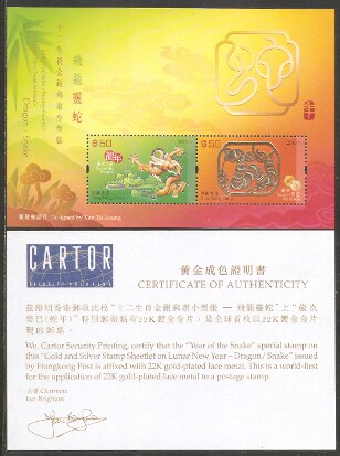 2013香港邮票,生肖蛇(金银),小全张(带证书)。