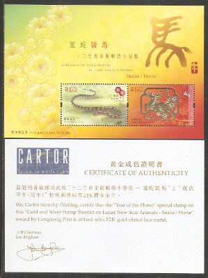 2014香港邮票,生肖马(金银),小全张(带证书)。