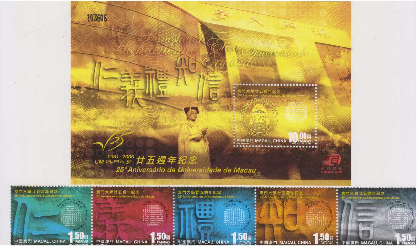 中国澳门2006年澳门大学25周年纪念(邮票5连+小型张)