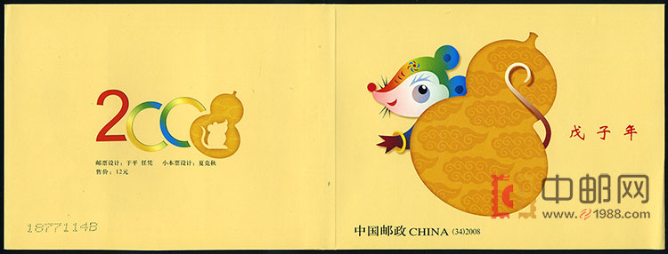 2008年是农历戊子年,即鼠年。第三轮生肖票的第五套。鼠是一种有灵性的动物,是顽强生命力和财富的象征。自古就有“鼠咬天开”的动人传说和“鼠送谷种”、“鼠嫁火种”、“鼠送光明”等故事。鼠在人们心目中是一种人文性动物,所画之鼠会像人一样站立行走、穿红戴绿、敲锣打鼓、娶亲嫁女。戊子年邮票的鼠姑娘打扮得花枝招展,漂亮又活泼可爱。高翘的嘴巴、灵动的眼神、卷曲的长尾巴,令人联想到“鼠咬天开、鼠上灯台”等吉祥趣味的故事。佛手、百合花和花盆把生肖鼠衬托得更加漂亮。寓意“美满多福、富贵满盆、百事和谐”的新年美好祝福。生动的造型、亮丽的色彩、精妙的意境,使画面充满了喜庆、和谐和吉祥的气氛。并同时发行小本票。