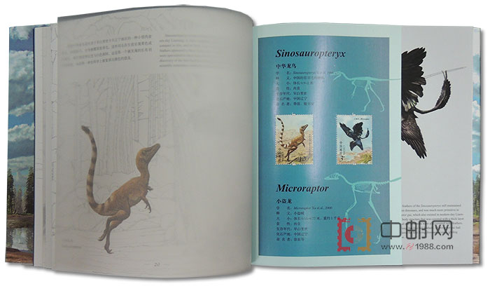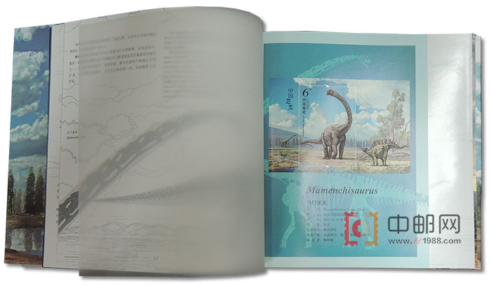 从1951年开始,古生物题材开始陆续出现在许多国家和地区的邮票上,其中尤以爬行动物,特别是恐龙题材邮票最受青睐。我国在1958年发行的特22《中国古生物》邮票中,出现过禄丰龙骨架和复原图的画面,这是世界上第一枚印有恐龙形象的邮票。此次《中国恐龙》特种邮票则是中国邮政首次发行以恐龙为主题的邮票。该套邮票以在我国境内发掘的恐龙化石复原图为主要内容,整体画面富有动感,兼具科学性和艺术性。套票版张以外形特征较明显的永川龙和华阳龙作为画面的视觉中心,将生活在中生代的恐龙由中心向四周做环状排布,套票版张边饰还描绘了其他几种不同类型的恐龙形象和当时的生态环境;小型张以马门溪龙为主体,边饰表现了沱江龙的形象,描绘了侏罗纪时期地球的生态环境。