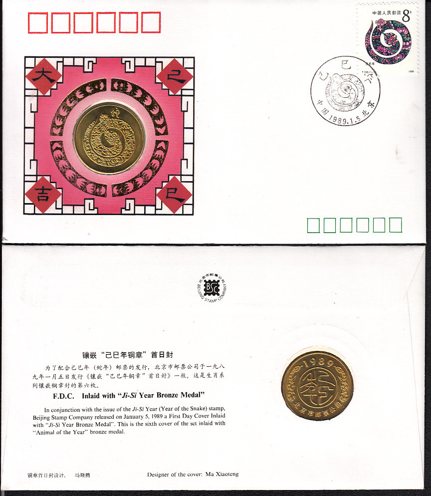 北京市邮票公司发行:1989年《己巳年》生肖铜章镶嵌首日封。