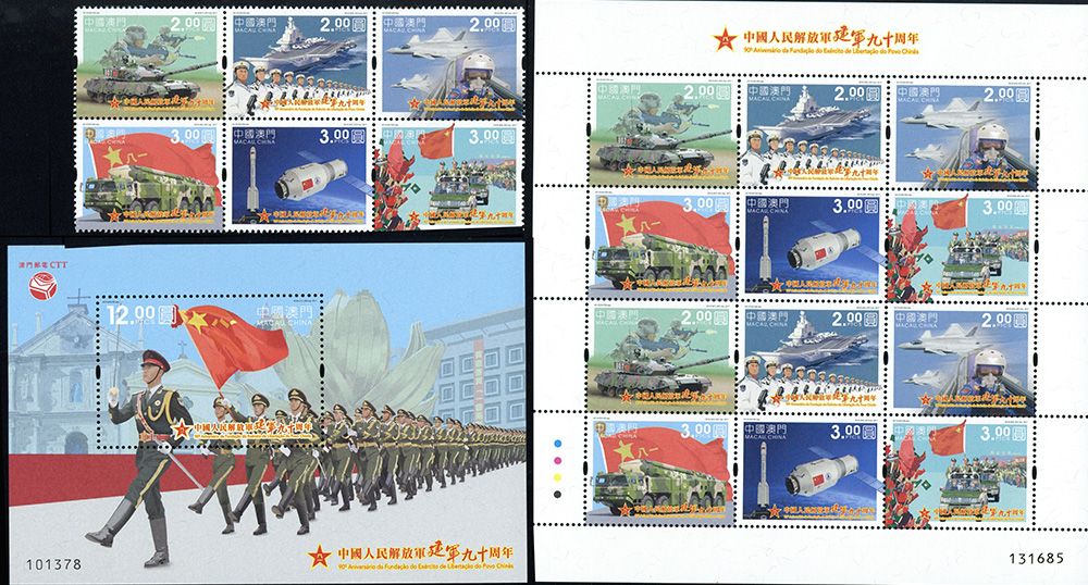 这次发行包括一套六枚邮票及一枚小型张,邮票图案展示了中国的核心军事装备,包括:ZTZ-96主战坦克、辽宁号航空母舰、歼-20隐形战机、东风-21D反舰弹道导弹、天宫二号,而第六枚邮票和小型张则展示了中国人民解放军驻澳门部队进驻澳门的情景。