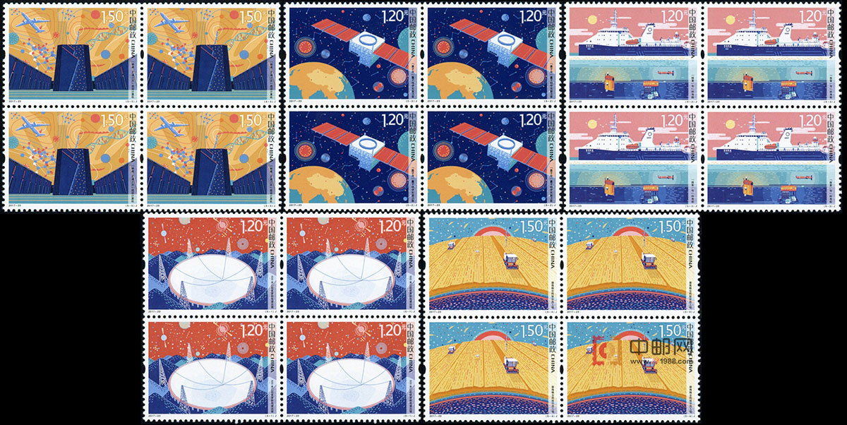 2017年9月17日发行的《科技创新》纪念邮票一套5枚,图案内容分别为:500米口径球面射电望远镜、“墨子号”量子科学实验卫星、“探索一号”科考船、渤海粮仓科技示范工程、“神威·太湖之光”超级计算机。全套邮票面值为6.60元。