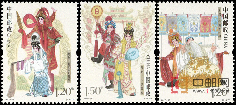 该套邮票表现了粤剧的“四件宝”,三枚邮票分别表现颇具岭南特色的《香花山大贺寿》《六国大封相》《玉皇登殿》这三出粤剧中的传统例戏,邮票版式一的边饰则表现了经典曲目《天姬送子》。该套邮票采用中国工笔重彩技法绘制,线条采用传统的“高古游丝描”与“钉头鼠尾描”结合,具有较高的审美价值。用色方面,着重在粤剧舞台服装的基础上适当加入中国画重彩元素,使整体画面更具传统审美韵味,同时也将三幅作品统一到粤剧特有的热烈、考究的色彩风格里。