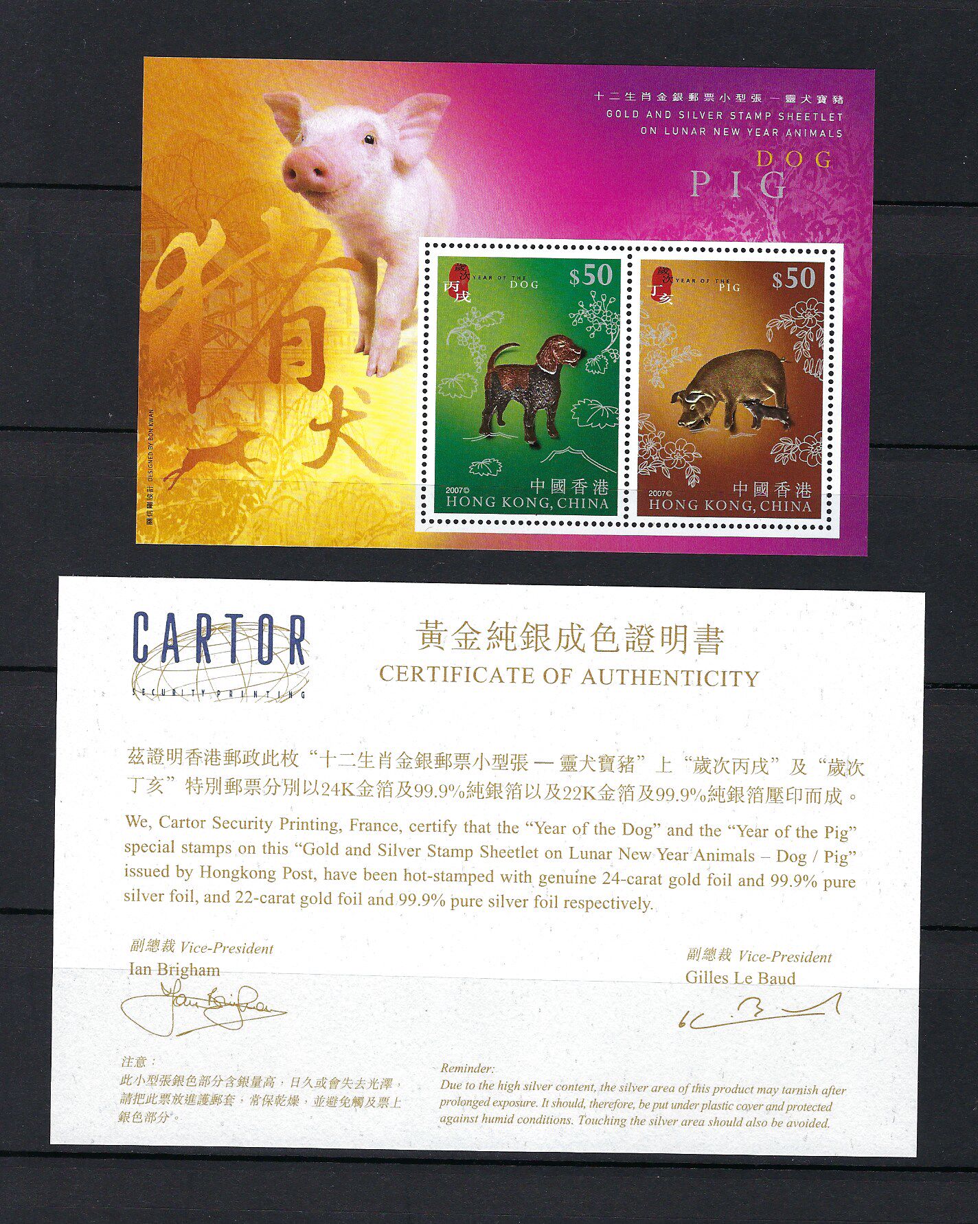 香港 2007 年 十二生肖 金银 邮票 小型张 灵犬宝猪 带证书