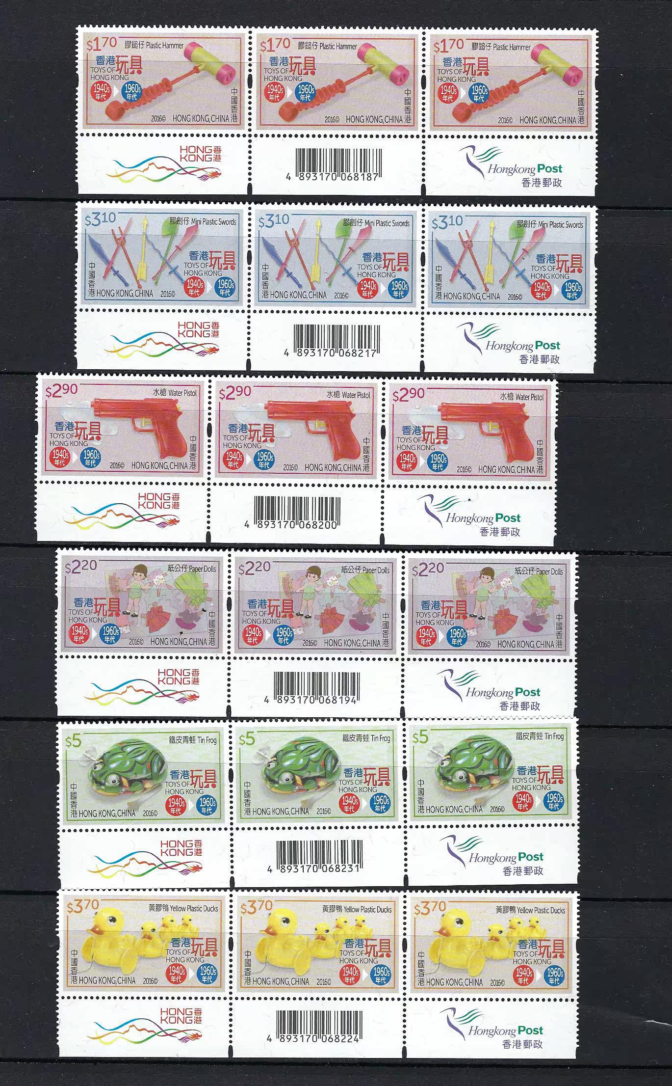 香港 2016 香港玩具 1940至1960年代 郵票 三連位 飛龍 雀仔