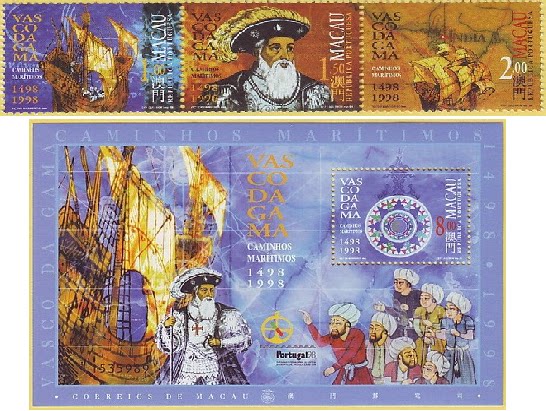 1998澳门邮票,华士古-航海路线(正版/1498),3全+小型张