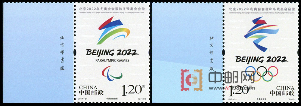 中国邮政将于12月31日发行北京2022年冬奥会会徽和冬残奥会会徽纪念邮票。