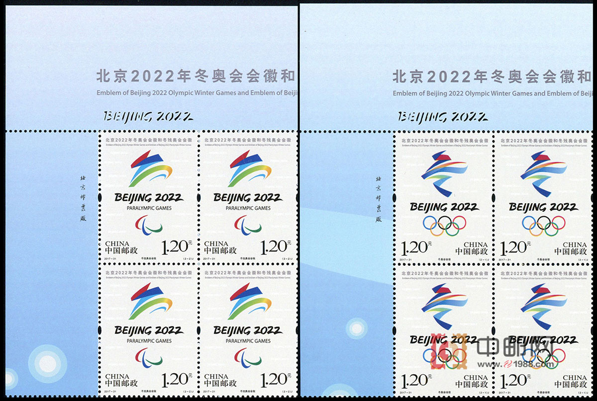 2017-31 北京2022年冬奥会会徽和冬残奥会会徽(厂铭四方连)