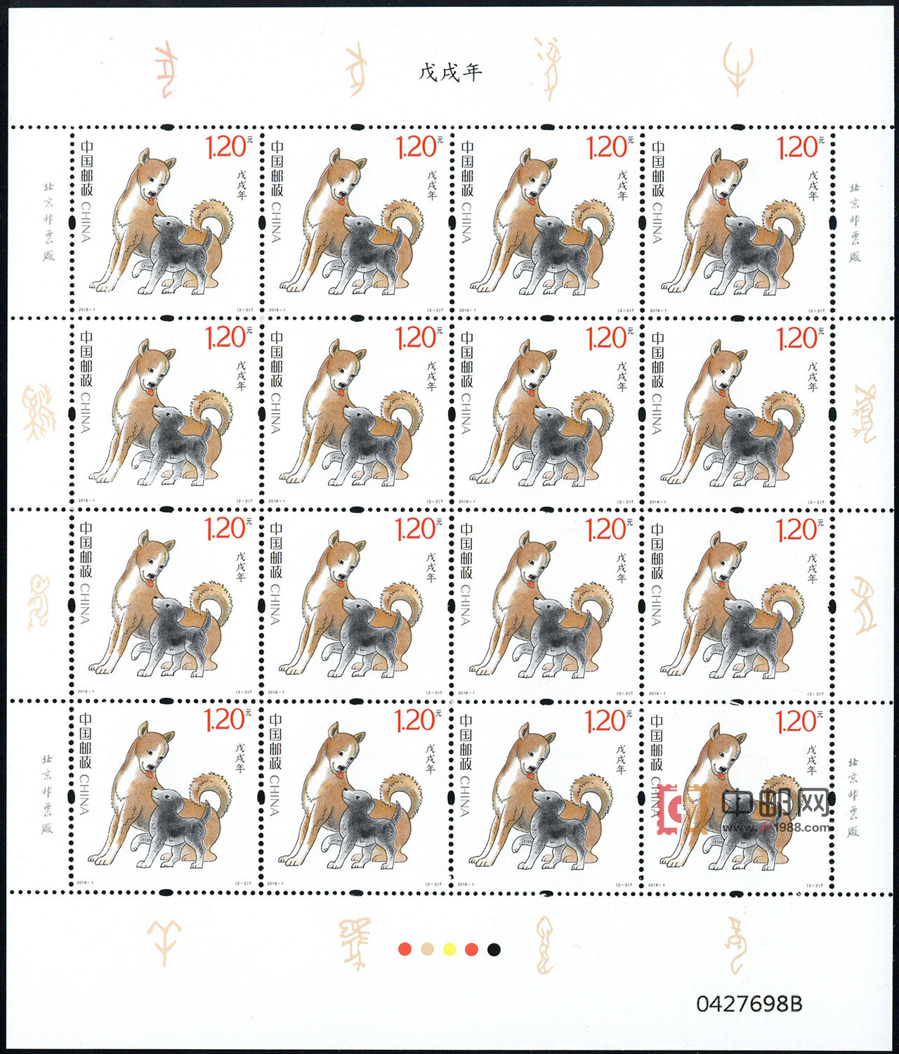 中国邮政定于2018年1月5日发行《戊戌年》特种邮票1套2枚,小本票1本。