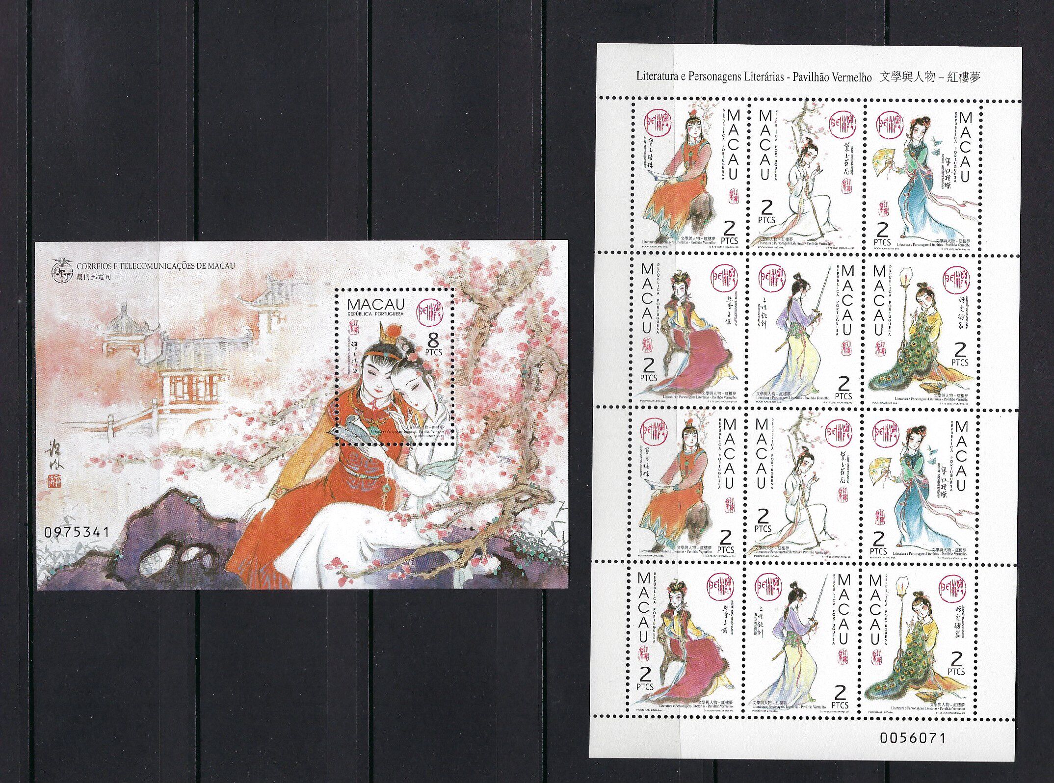 澳門 1999 年 文學與人物 紅樓夢 一組 郵票 小型張 + 小版