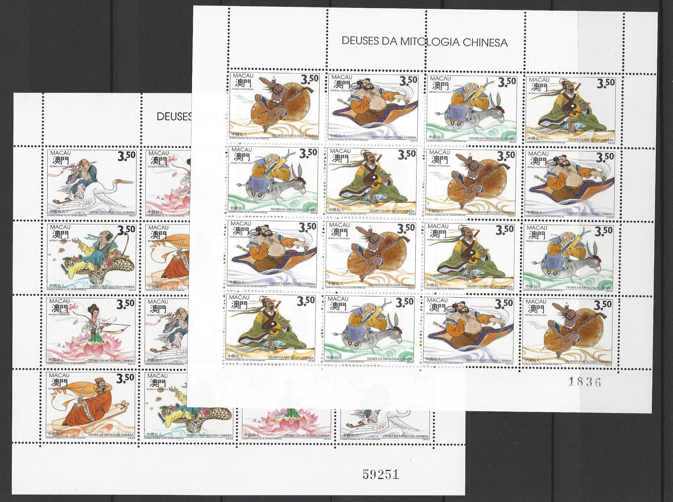 澳門 1992 1993 神話 八仙 一 二 仙人 郵票 小版張 x 2 全品