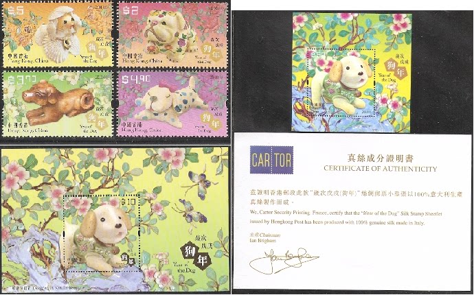 2018香港邮票,生肖狗,4全+小型张+丝绸张。