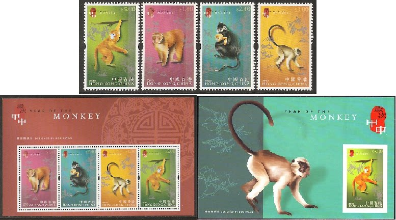 2004香港邮票,生肖猴,4全+小型张+小全张