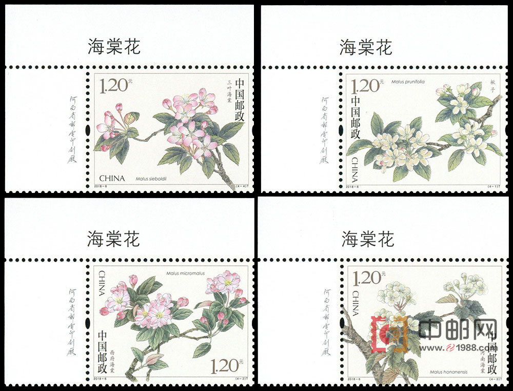 海棠花是新中国首套雕刻版花卉邮票,可见今年邮政对此票的重视。设计者龚文桢,1945年出生,当代中国工笔花鸟画领军人物,师傅是著名画家田世光和李苦禅,1988年的兰花和2005年的玉兰花就是他设计的。