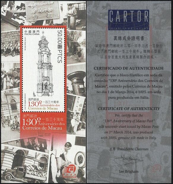 澳门2014年澳门邮政一百三十周年纪念邮票丝绸小型张