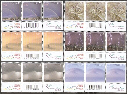 2014香港邮票,天气现象,3连(飞龙 雀仔 条码)。