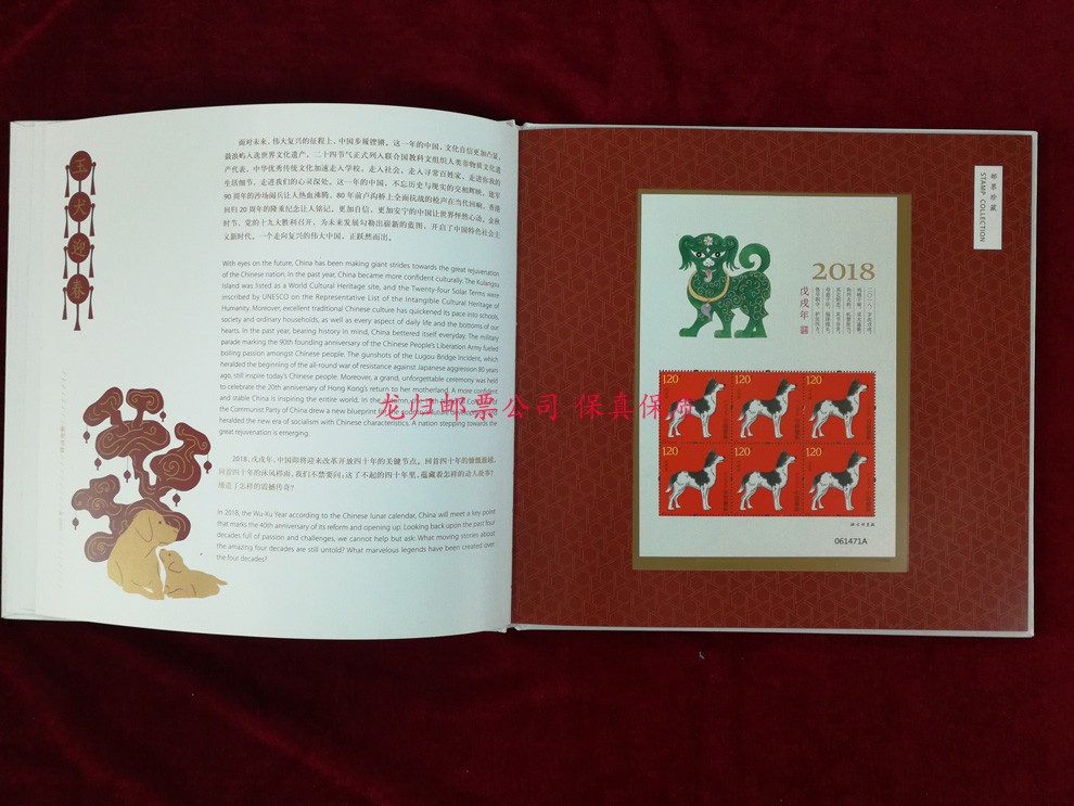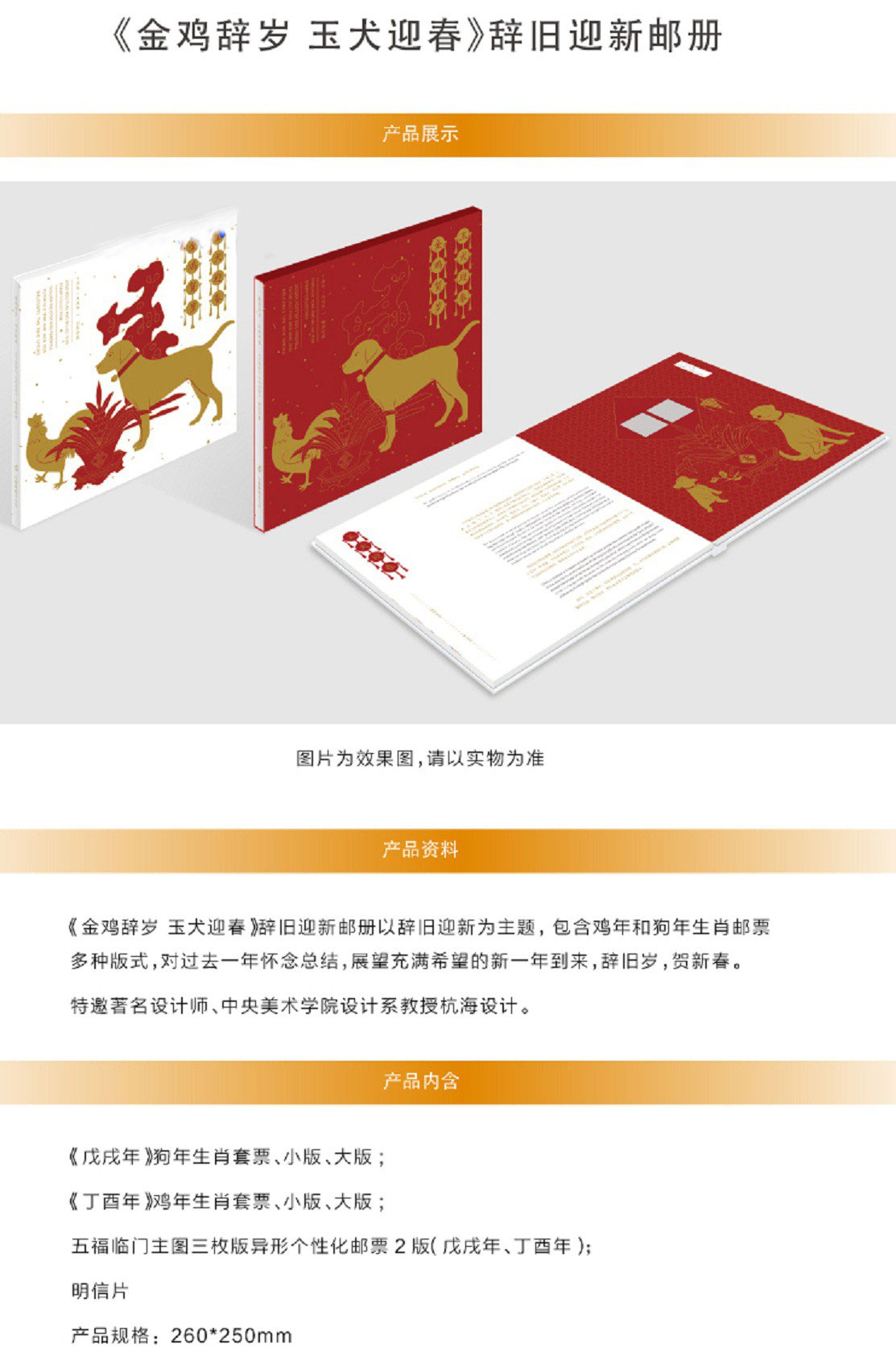 邮册内含《戊戌年》狗年生肖套票、小版、大版;《丁酉年》鸡年生肖套票、小版、大版;五福临门主图三枚版异形个性化邮票2版(狗年、鸡年);明信片。