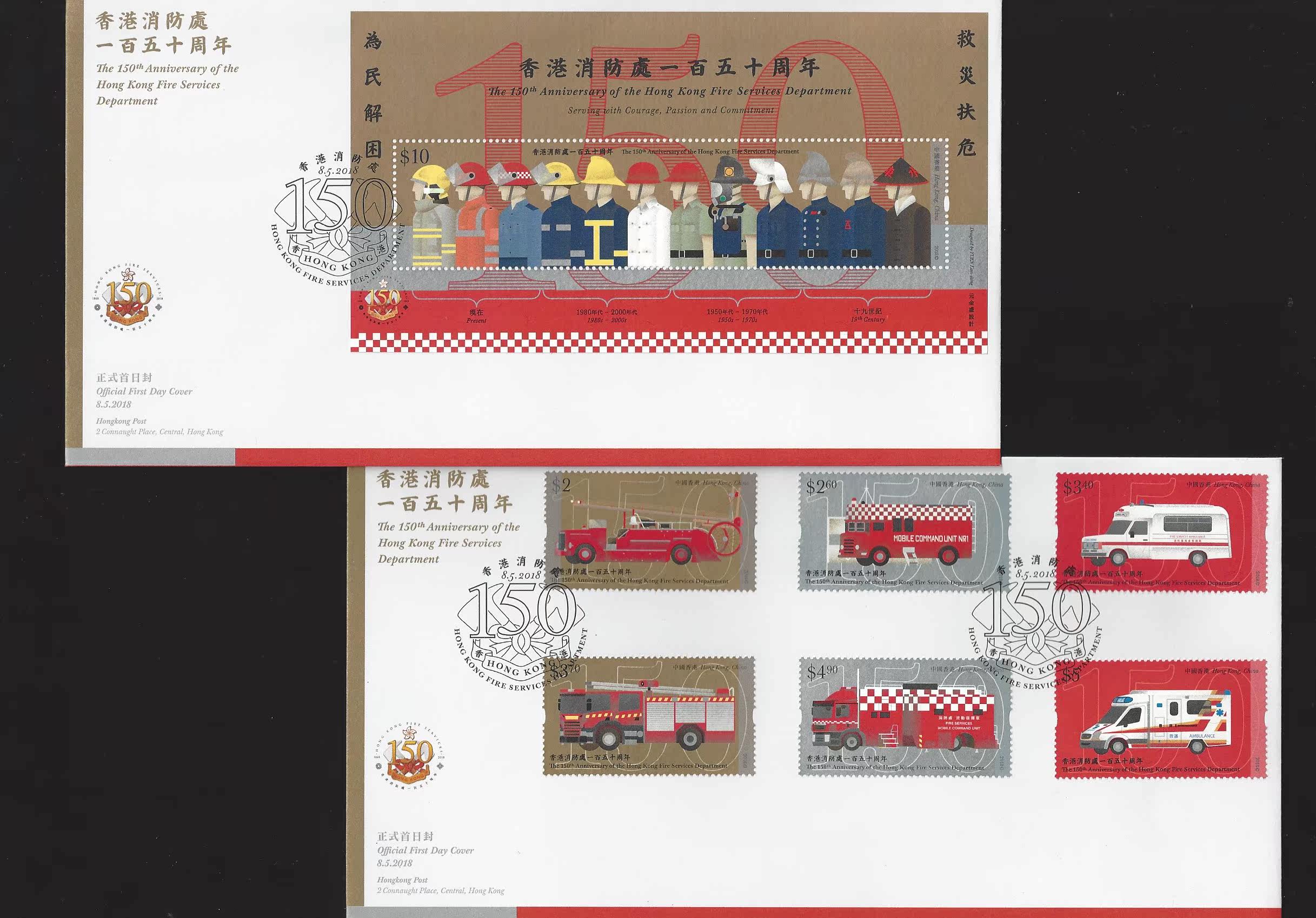 香港2018年《香港消防处一百五十周年》贴邮票+型张+小本张首日封
