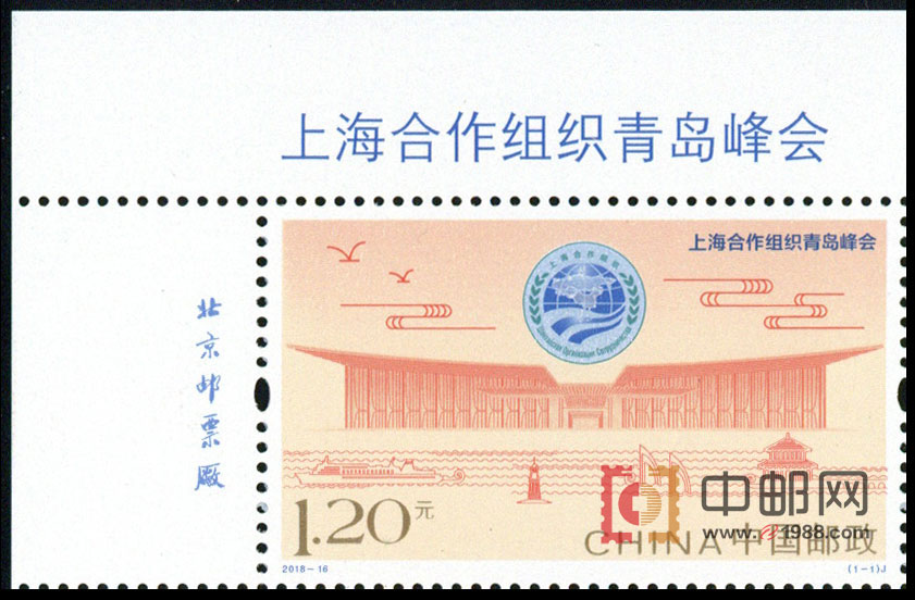 上海合作组织成员国元首理事会第十八次会议将于2018年6月9日至10日在山东省青岛市举行,中国邮政特发行《上海合作组织青岛峰会》纪念邮票1套1枚。邮票以上海合作组织会徽及主场馆——青岛国际会议中心线描图为主要元素,以祥云、海鸥为装饰;画面下方仍以线描手法,表现海上栈桥、帆船、灯塔、轮船等景物,展现了会议举办地——黄海明珠青岛的特色。整体设计简洁明快,主题突出。