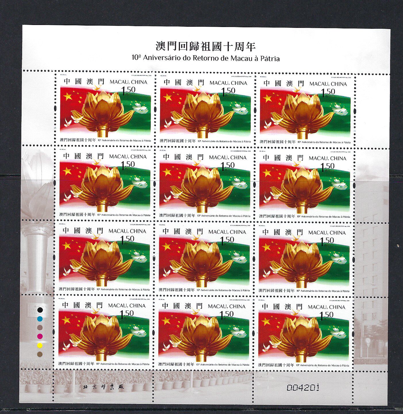 2009 澳門 郵票 回歸 祖國 十周年小版,金蓮花特別版式