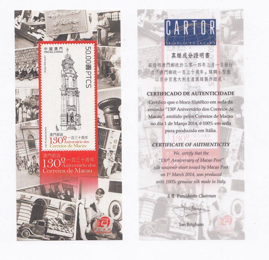 2014 澳門郵票 澳門郵政百三十周年 絲綢 小型張