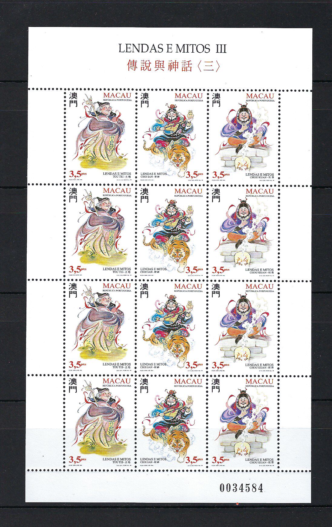 澳門 1996年 傳說 與 神話 三組 - 土地 財神 灶君 郵票 小版