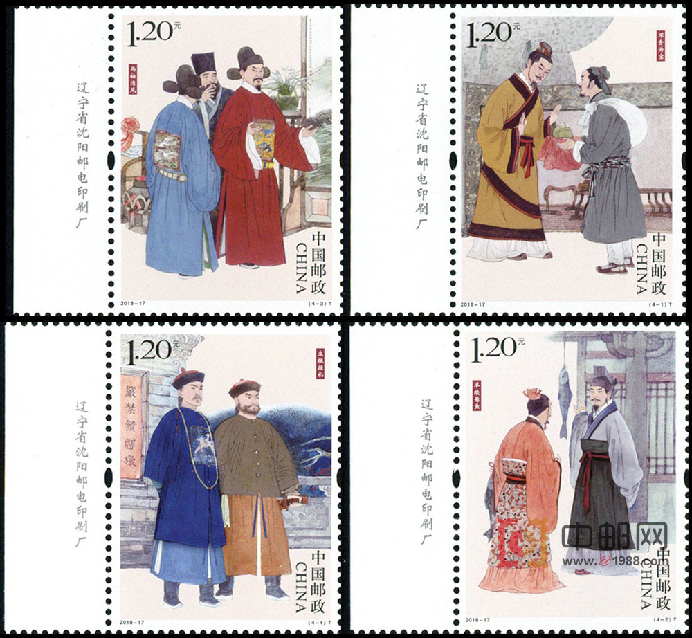商品详情:中国邮政定于2018年6月24日发行《清正廉洁(一)》特种邮票1套4枚。表现四个反映清正廉洁的故事:不贪为宝、羊续悬鱼、两袖清风、立檄拒礼。
