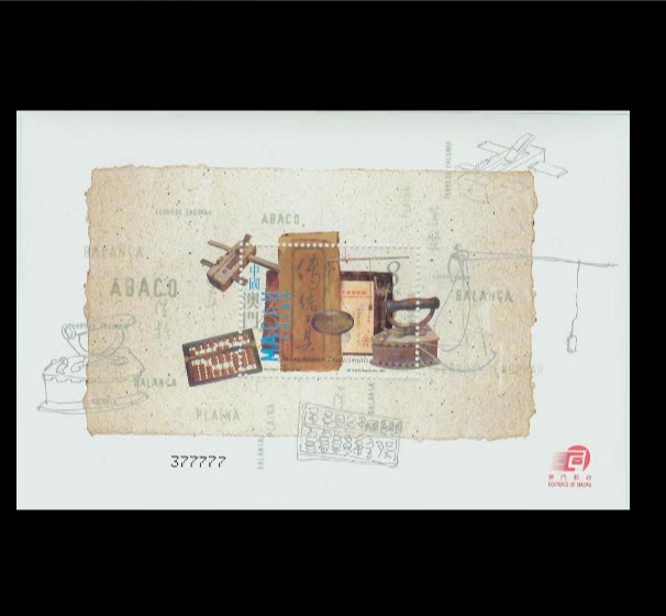 MB016 澳门2001年传统工具一算盘 称 刨 熨斗等邮票小型张 M