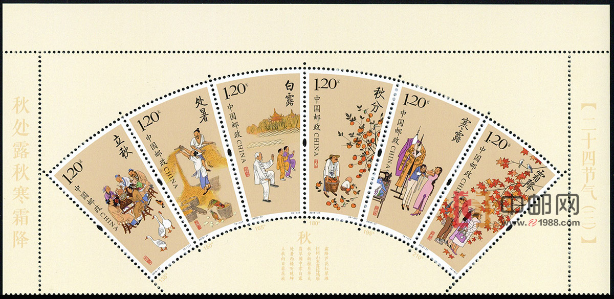 - 商品详情:中国邮政定于2018年8月7日发行《二十四节气(三)》特种邮票1套6枚,邮票图案名称分别为:立秋、处暑、白露、秋分、寒露、霜降,全套邮票面值为7.20元。