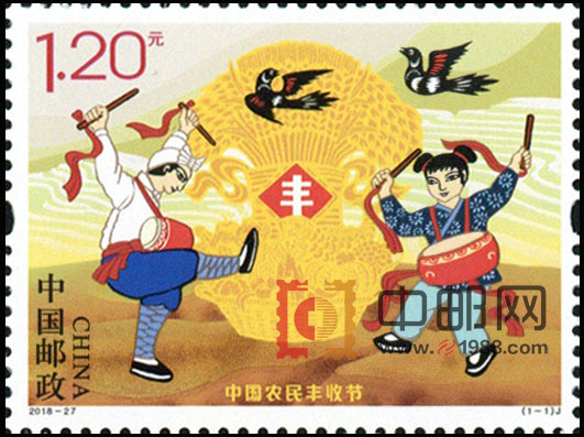 邮票表现了农民在金秋时节庆祝丰收的场景。画面中一对年轻的夫妇在舞动鼓槌欢快地舞蹈,在他们背后,金黄的庄稼溢满粮仓,空中飞来的喜鹊更是增添了丰收的喜庆氛围,画面远处表现了南方的梯田,前景与背景相互呼应,形成了一幅全国上下“庆五谷丰登、享丰收喜悦”的美好画面。